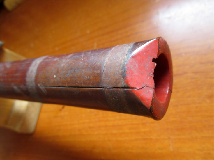 歌口は欠けと浮きの他、周辺は赤漆を塗りたくられた妙な修理がされている。その漆部分を剥がしてみると、膠で軽く差し込まれているだけなのか角が非常に脆く、簡単に外れる。角が入っていた部分や周辺は水気が侵入しており、少し腐っている。角に虫食いがあったので、その周囲を調べていると壁面が剥がれ、中から粒膠のようなものが大量に出て来る。どうやら竹自体にも虫食いが広がり、以前は応急的な詰め物をしたのみの修理を行なったようだ。歌口直下の左側面で範囲はおおよそ縦4cm×横2cm×奥0.5cmほど。