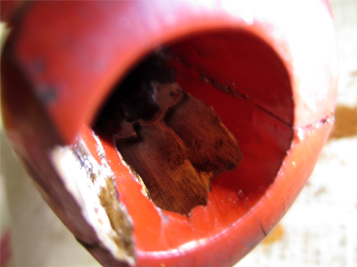 虫食いと腐りについては、少し補強をし、形を均してからすいている所に少し地漆を付けた。この地付けは音程を変えるためのものでないことだけは、明言しておこう。