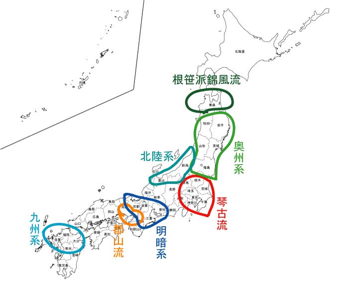 現代の隆盛具合を考えれば、都山流と琴古流の分布は全国に広がっているのですが、その興った地域・元の団体を考慮して初期の勢力圏を範囲として記しました。