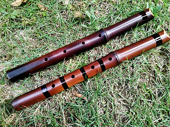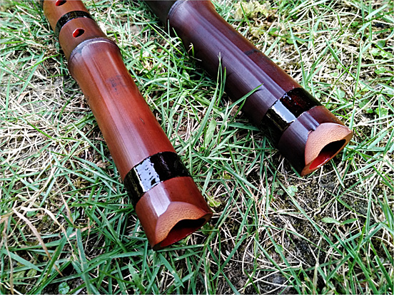 黄鐘調(A、ラ)の一節切です。管内は赤漆。本物の煤竹の為、ところどころ割れが合ったりなどした為、割れ止めも行っている。割れ止めは古い一節切に多い漆塗り。上のものには、管尻部に虫食いがった為、そこを漆で埋め、管尻には銀伯を貼り、白檀塗り風に仕上げている。