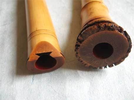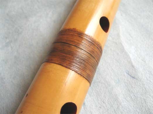 特徴は、中継ぎには独自に工夫した籐巻きの代替材料を巻き、そのうえから拭き漆で染め上げたり、他に中継ぎ内部は黒漆に上部だけは赤とワンポイント変えている。そして、最大の特徴は、2段階で反っていることだ。普通は、湾曲は管尻のみでなっているものだが、この竹は5孔上の節も反っている。そこをあえて、矯めで直さずそのまま使用した。その為、管内部の気流の流れが指孔に沿うように流れ、鳴りのよさを得ているのではないかと思う。色々と工夫してみたり、遊び心を加えてみたりと他にはない、オンリーワンの一本に仕上がったのではないかと思う。