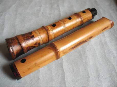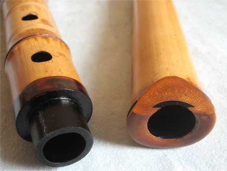 扁平であるため吹きやすく、音の鳴りもよいが、残念な事に製管前から下管部分に割れがあった。その部分には、籐巻きで割れ止めを施している。上管部分の傷については、割れも広がっておらず面白いのでそのままにしている。歌口は、昔の都山流の尺八らしく、アゴ辺り周辺に丸みを持たせた。中継ぎには、変り塗りで根来塗りを施し、黒地に朱が明け方の雲のようにたなびく模様を浮き出している。
