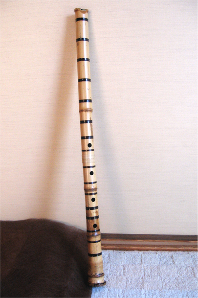 管内は黒漆塗り、中継ぎは籐巻き、歌口は琴古流の銀巻きで拵えている。 正倉院にある御物の一つ「呉竹御杖刀(クレタケノゴジョウトウ)」というものに感化された作った作。割れ止めが16箇所も巻かれていることにまず目が行くが、これはもともと真っ二つに割れてしまっていた良材の竹をそのまま割れ止めして作った為。写真では解りにくいが、特殊な漆巻きの為、使い続ければ紅く透けて実に良い風情になる。
