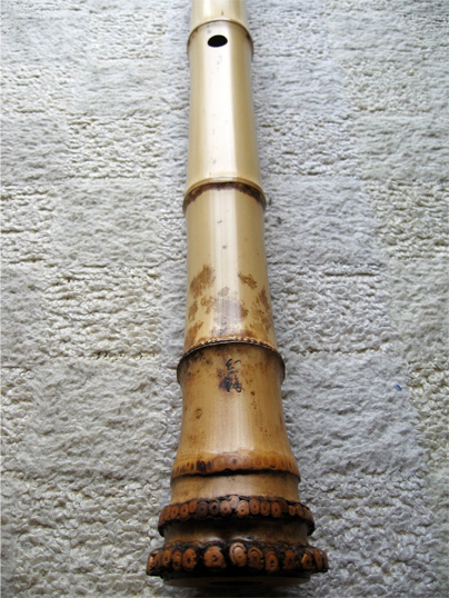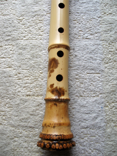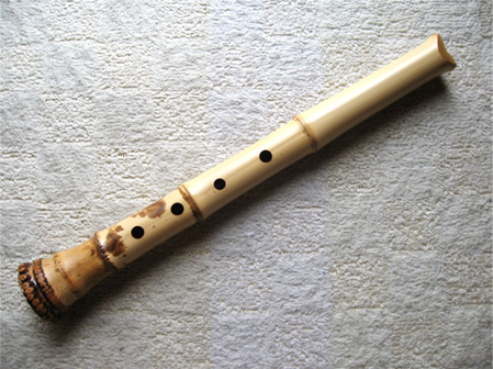 管内は赤漆塗り、延べ管。歌口は、あまり頻繁に出るようなサイズではないので入れていない。ご要望があれば、お好きな形で入れることも可能です。裏開きで根っこの形もいいものです。基音は西洋音でソ(G、双調)の音になります。 →画像クリックで拡大します。