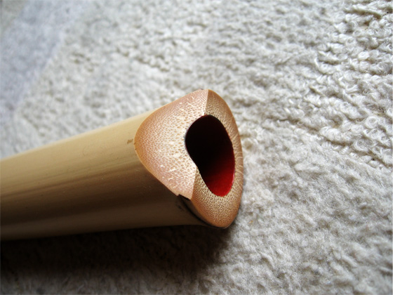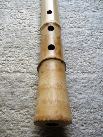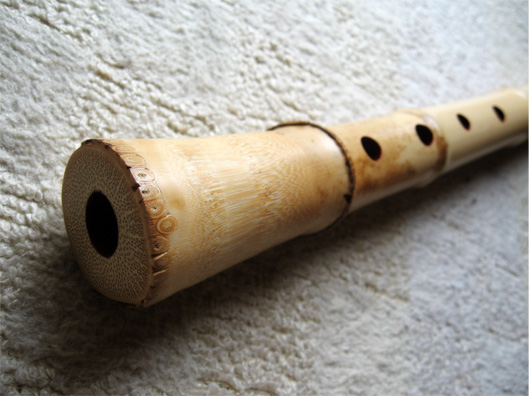 管内は赤漆塗り、延べ管、管尻はボウズにしている。歌口は、あまり頻繁に出るようなサイズではないので入れていない。ご要望があれば、お好きな形で入れることも可能です。裏開きで根っこの形もいいものです。基音は西洋音でソ(G、双調)の音になります。 →画像クリックで拡大します。