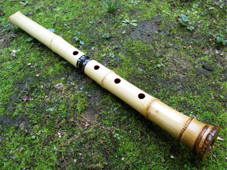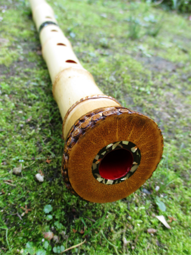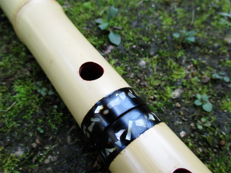 一尺六寸管(in E)。「女性が持つのに相応しいもの」というコンセプトの元に製作した尺八。細身で重量は軽くなるように工夫している。管内は赤漆塗り、歌口は黒水牛角に銀巻き、中継ぎと管尻には螺鈿を装飾している。音色は柔らかめで古曲向き、近現代の煌びやかな音が好きな人には向かない。 →画像クリックで拡大します。