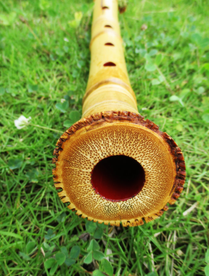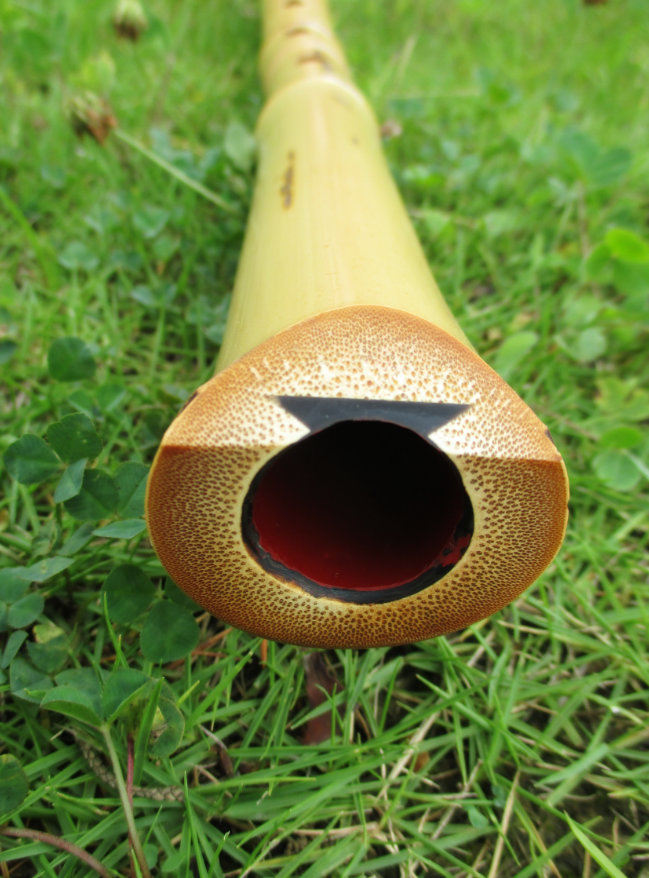 反りがあって美しい曲線を描いた竹。新管でまだ竹が開ききっていないことと、広作りのため管内口径が広く、吹きこなすにはそれなりの年数を要するだろうが、竹も吹き手も成長したころには素晴らしい音色になることであろうことを想像させる一本。