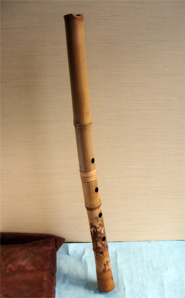 管内は黒漆で中継ぎは友心竹(同じ竹を削りだしたもの)で籐巻き、、歌口は琴古流のプラスティック、斑模様は2孔のところまであり、歌口から一節目までの間はゴマを散らしたような模様がある。長さは約62Cmと二尺ほどしかないが、管内の広さなどから二尺一寸の律(B)となっている。