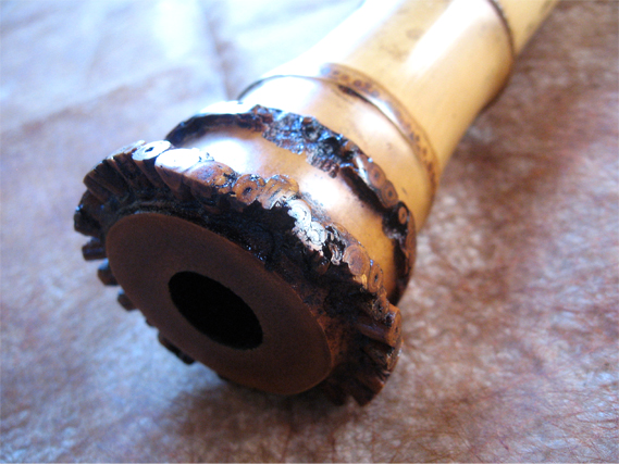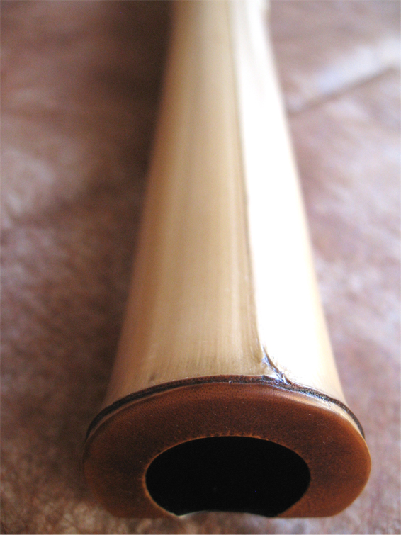 延べ管で管内は黒漆で磨き上げ、歌口は黒水牛を入れ、明暗系の形になっている。肉厚の良質な竹材で、節はボコっと力強く盛り上がり、竹は表開きで7節あり、心地よい反り具合が実に美しい。歌口から節の間がめくれ上がっているのが特徴的。