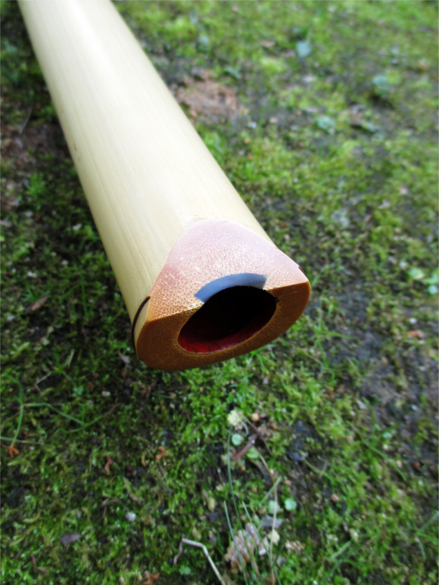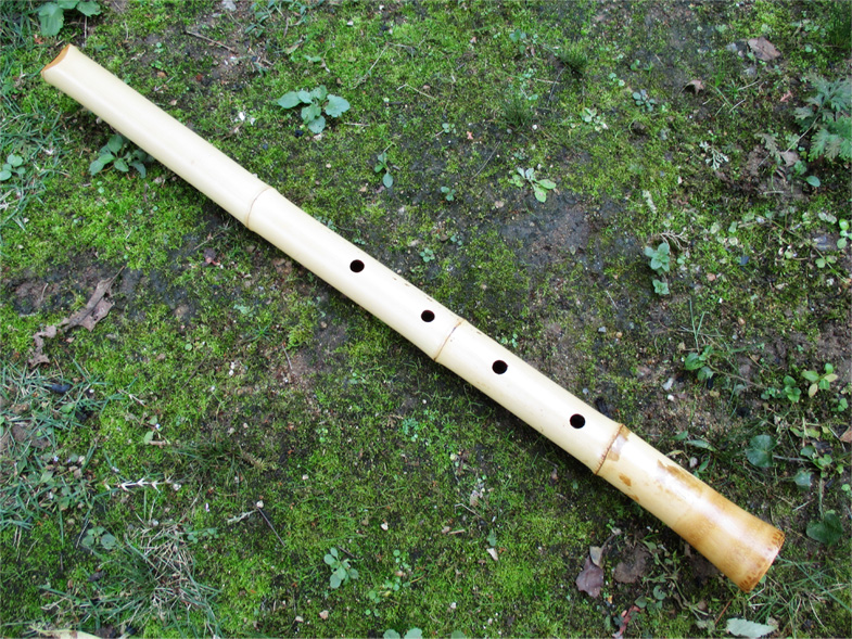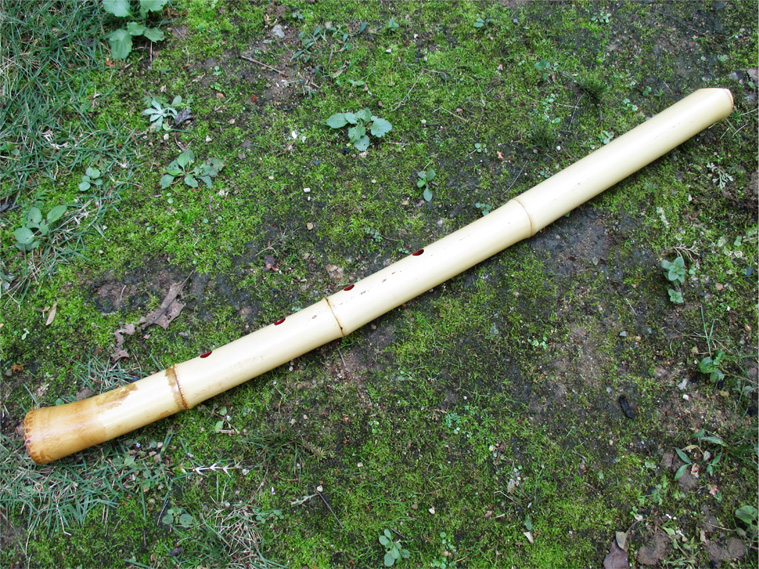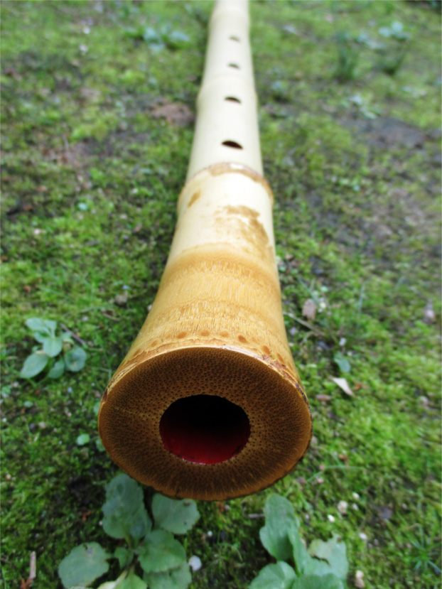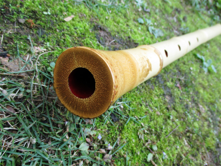 正二尺二寸の延べ管で律は正律のB♭(シ♭)、音程は438Hz前後と少し低くしている。管内は朱漆で磨き上げ、歌口は黒水牛を入れ明暗系の形。少し反り身の竹。音色は柔らかくふくよかな響きがする。 →画像クリックで拡大します。 価格:200,000円