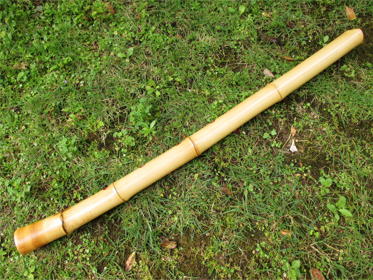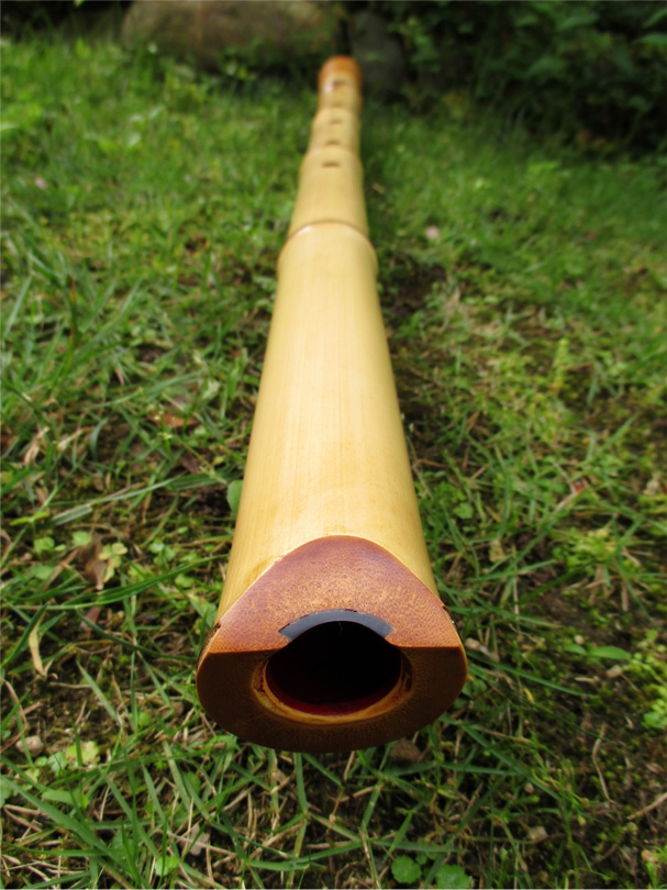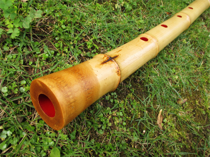 正二尺六寸の延べ管で律は2尺5寸律のG(ソ)、音程は442Hzほど。管内は朱漆、歌口は黒水牛を入れ明暗系の形。