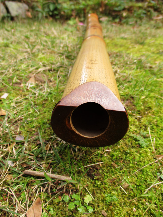 正二尺七寸の継ぎ管で友心竹。律はF♯(ファ♯)ほど、とはいえ地無し豪管なので吹き手によって変る。管内は漆を塗らず、歌口は入れず。地無しのこの太さ・長さで中継ぎを作ることは非常に難しく、そういった点でも非常に珍しい竹である。通常、地無しで中継ぎを作る場合は、友心竹であるが、友心竹で作ったとしても、ホゾとホゾ穴の微妙な内径の違いから段差ができる。本管は非常に内部も滑らかに繋げることができている。中継ぎ外側は籐巻きに漆塗りにしている。吹くのは大変だが、吹いて面白い竹である。