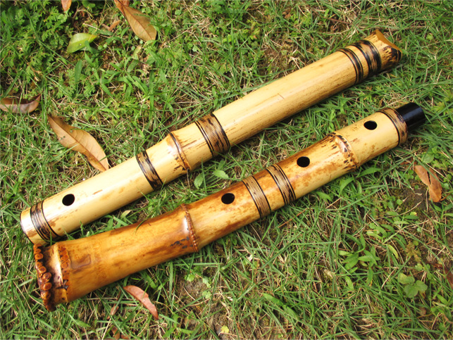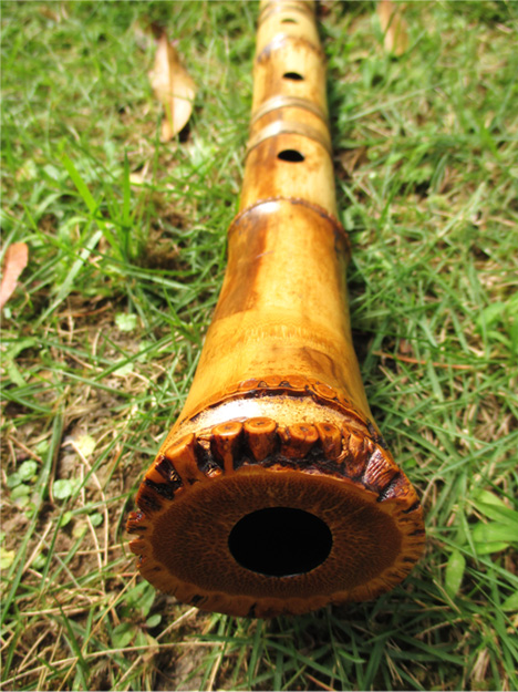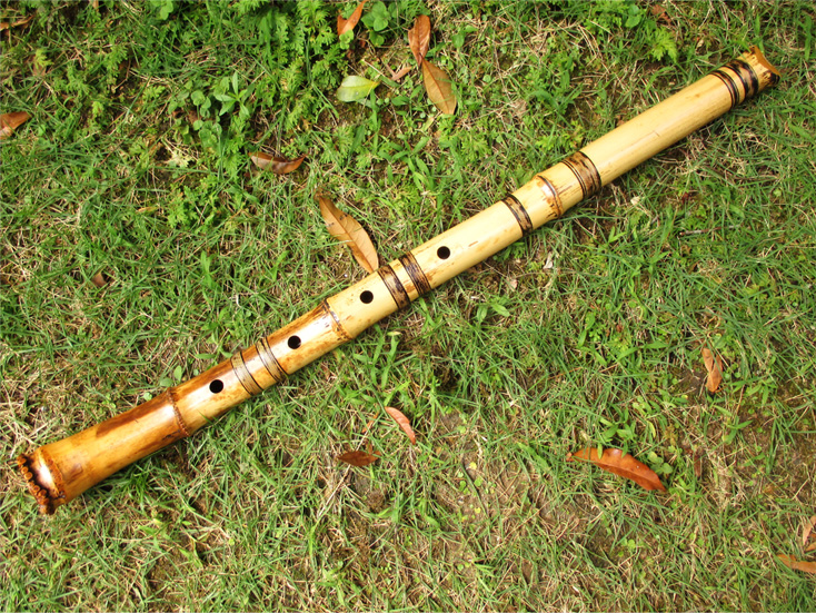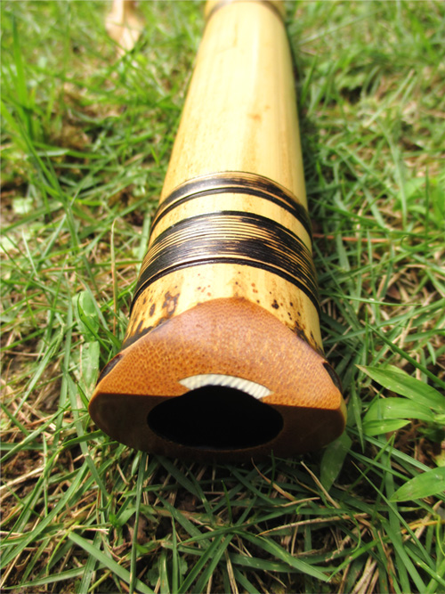 正二尺二寸の継ぎ管で友心竹。律はシ♭(B♭)だが本曲用に436Hzとやや低めにしている。管内は黒漆、歌口は明暗型で象牙。管尻~2孔にかけて良い斑模様があり、写真では解りにくいが反りがある。籐巻きはしているが、割れはなく化粧巻き。