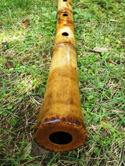二尺三寸管。律は442HzでB♭(シ♭)~A(ラ)の中間ほどと低めで、本曲向きの竹。管内は茶系の漆。斑模様が入っており、見た目に面白さがある。