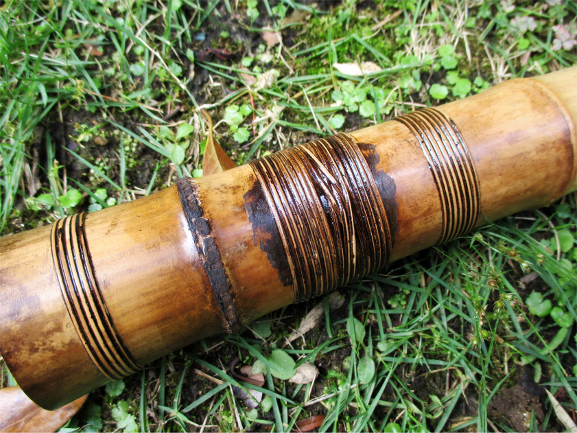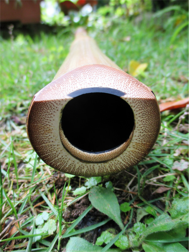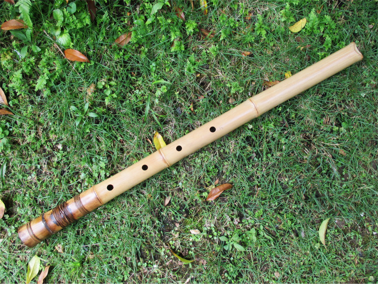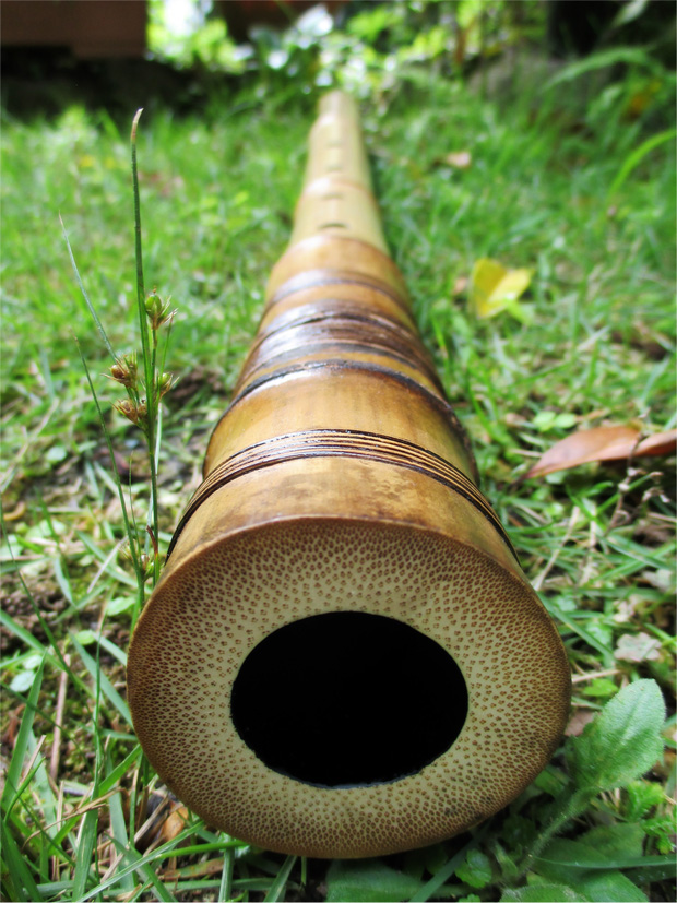 下記写真でも解る通り、歌口穴が大きすぎたので別の竹が嵌められている。また節数は5つであるが、その代りに管尻部には化粧籐巻きを施し、間延びしないようにしている。前述二点が見た目の上では欠点であるが、鳴りは中々良く、吹きごたえのある竹。