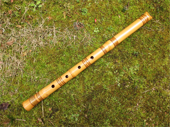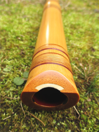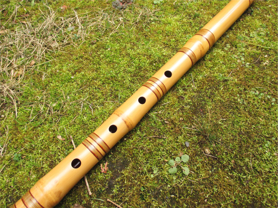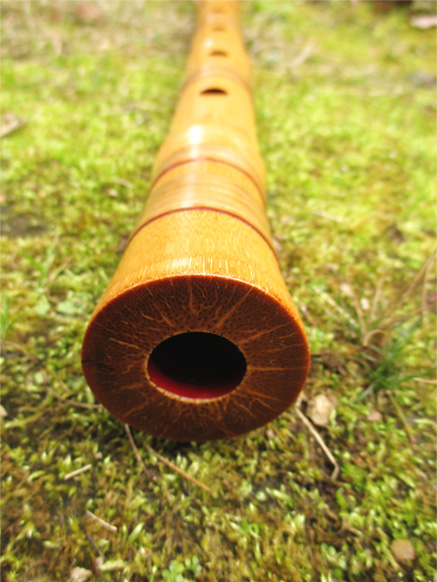 歌口は象牙で細めの明暗型。管内は赤漆だが、根来塗り風になっており、使い込めば下地の黒漆が出てくるような作りになっている。竹の表面は近藤宗悦管にならって、皮を剥ぎ、籐巻きで全体に渡り化粧巻きを施している。音色は澄んでおり、音量も十分にある。