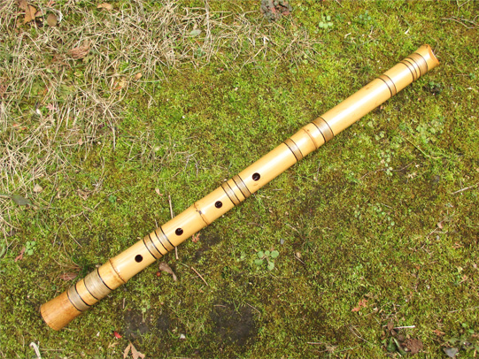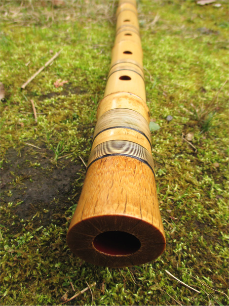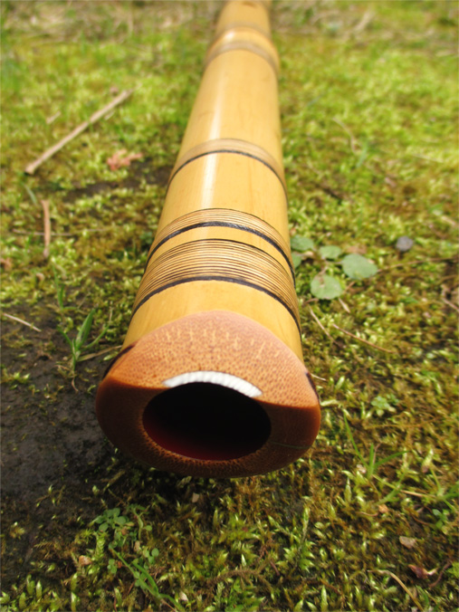歌口は象牙で細めの明暗型。管内は赤漆。もともと歌口側面に割れがあったことから、一部分のみに籐巻きをするならと、古管に習って全体に化粧籐巻きをしている。割れの部分は蒔絵(平蒔絵、高蒔絵)を施している。明暗真法流向きの竹。