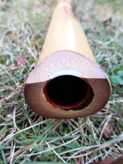 昔ながらの製法で作られた虚無僧尺八(※)。管内は赤漆を用い、歌口は鹿角で明暗型。管尻はボウズ。節の均整もとれた美しい尺八。