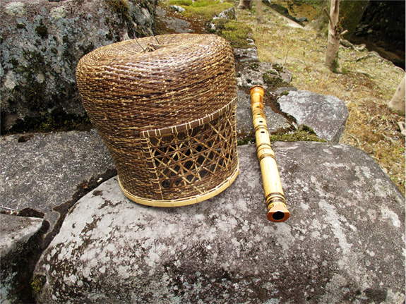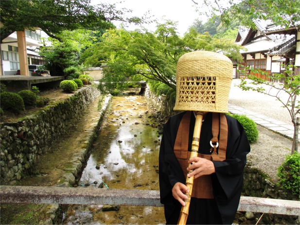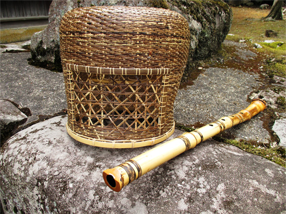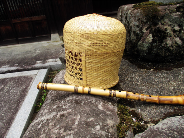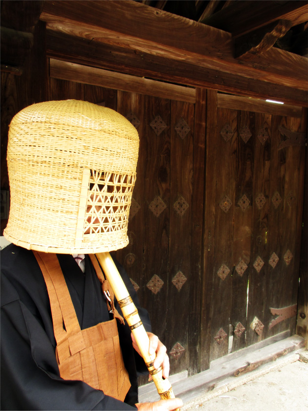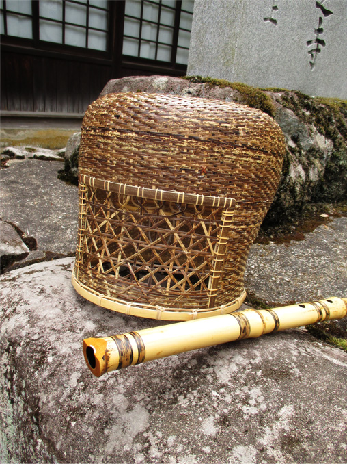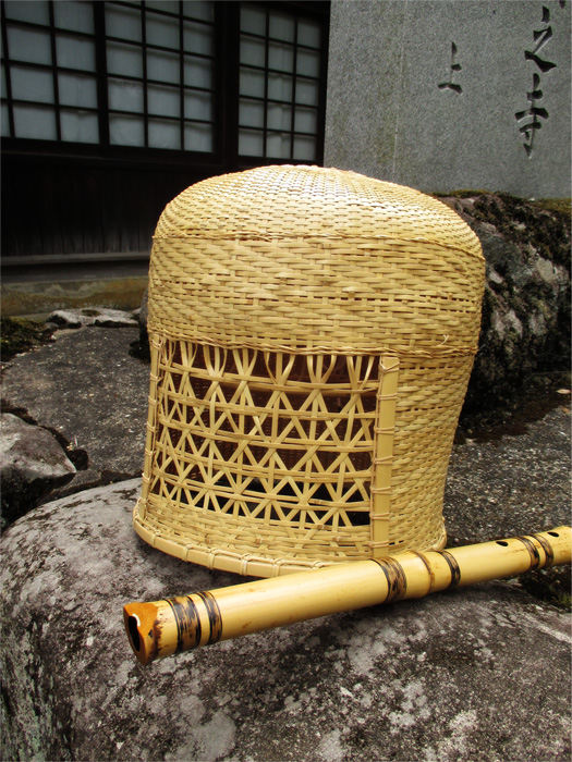 虚無僧がかぶっていた天蓋。現在では、竹製のものは製作や材料加工の難しさからほぼ作られず、イ草製のものが主流になっています。ただ、イ草製のものは強度が弱く、少しの衝撃や経年劣化、長年の紫外線などで破損することがよくあります。