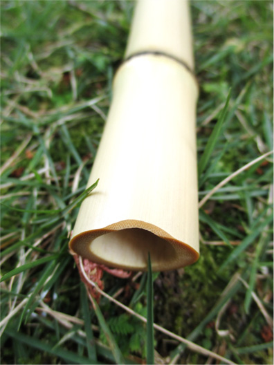 管内は漆は塗らず、昔ながらの自然由来の方法で腐らないように加工しています。歌口は尺八とは異なり、内側を削る洞嘯型のようになっています。こちらの天吹は、裏孔位置が現在主流のものとは異なり、失伝してしまったタイプになります(吹奏法、音色に違いはありません)。価格は3万円。