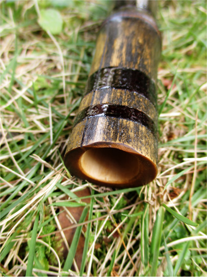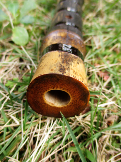 管内は漆は塗らず、昔ながらの自然由来の方法で腐らないように加工しています。歌口は尺八とは異なり、内側を削る洞嘯型のようになっています。全体に数か所割れがあったので、昔ながらの漆巻きで割れ止めを行っています。